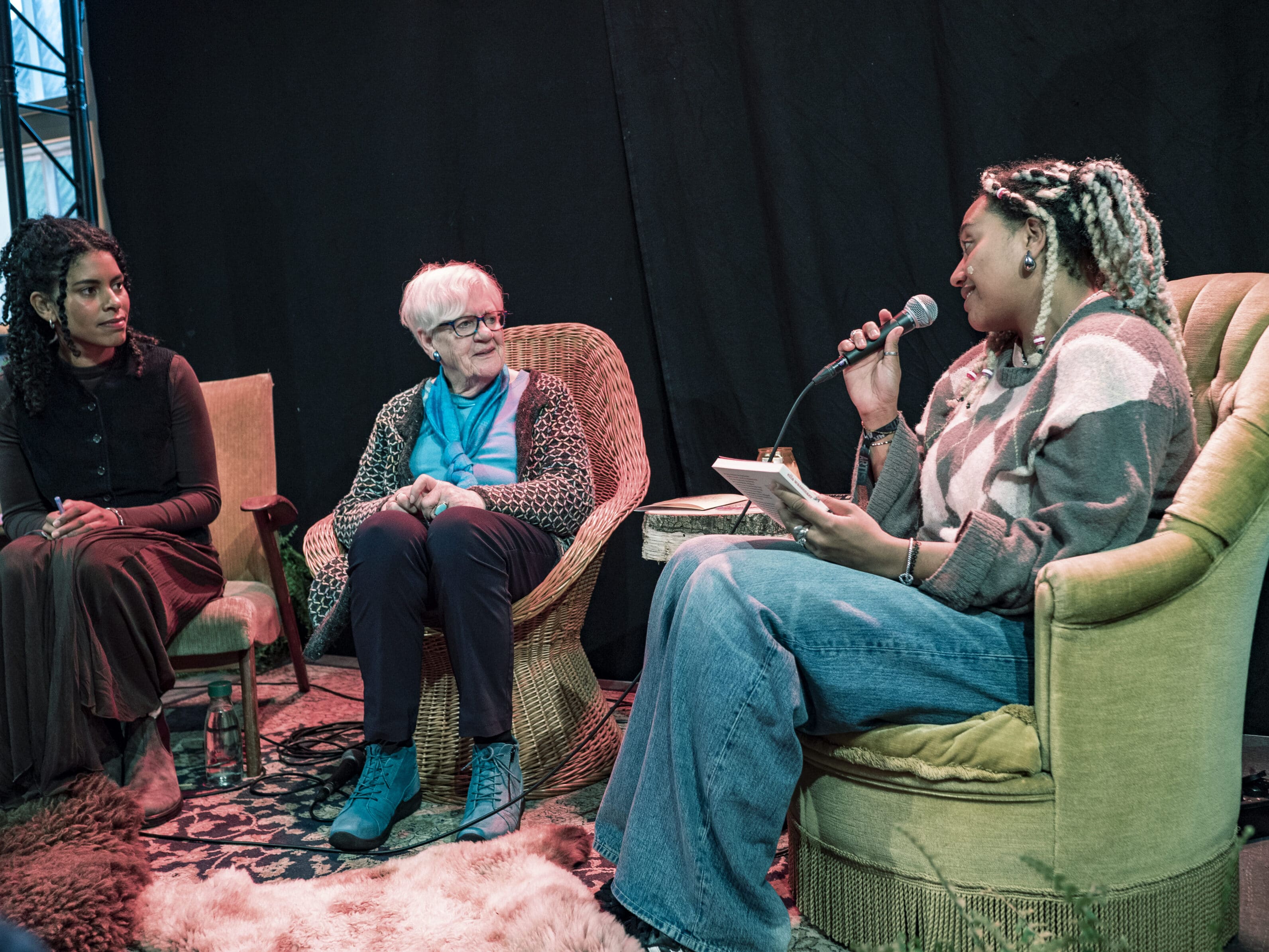 Presentatie van rode runen. De herontdekking van de visionaire dichter Ella Wassenaer op het festival Explore the North in Leeuwarden, editie 2025. Met van links naar rechts: dichter Sophia Blyden (die een essay schreef in het boek), Ypkje Hoekstra-Pos (dochter van Ella Wassenaer) en vertaler en dichter Zindzi Tillot Owusu© Dieuwke de Jong / Explore the North