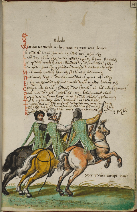 Ballade met acrostichon ‘Willem de Gortter’, met de verzen ‘Mint uwen naesten, ten sal u niet berouwen / Doet uwen vijant deucht, wie dat is groot oft cleijn’© Koninklijke Bibliotheek van Belgie (KBR), Brussel