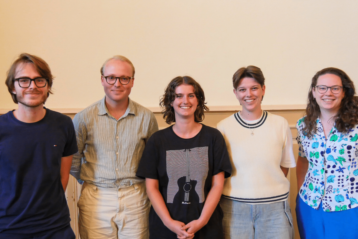 Dit is De Mediakaravaan 2025: Joachim Hoste, Thijs Lindhout, Vera van der Heijden, Sien Coolsaet en Femke van de Griendt. Nadia Shutova ontbreekt op de foto© de lage landen