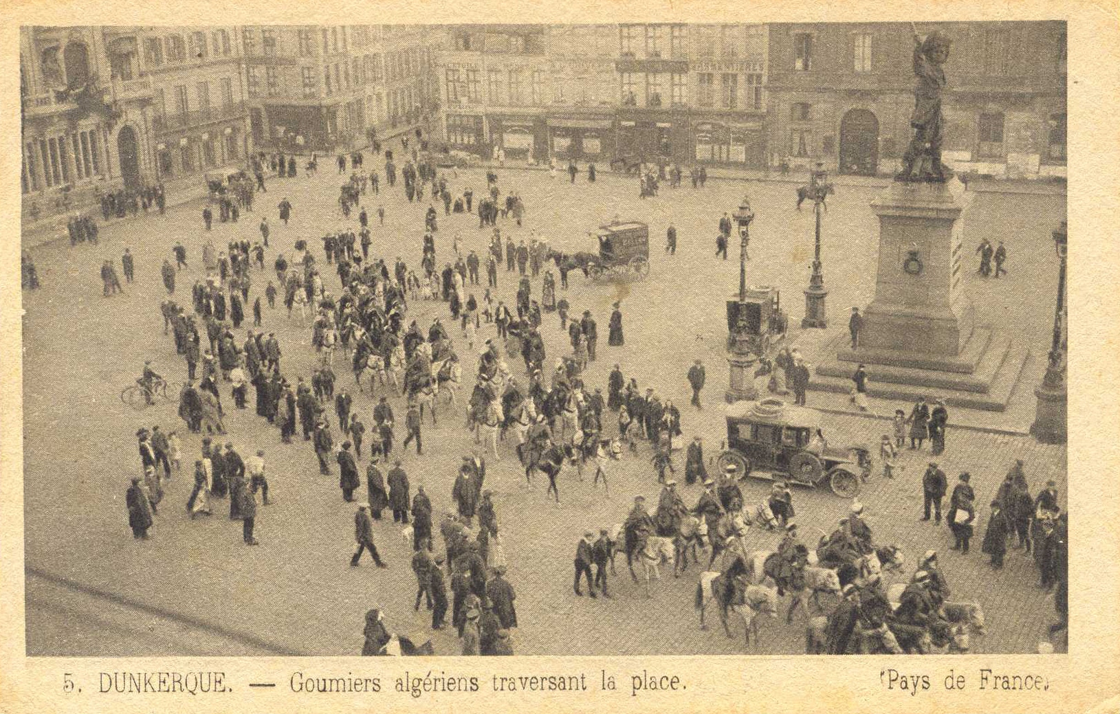 Algerijnse goumiers (koloniale soldaten) op het Jean-Bartplein in 1915.Al snel ontbrak het aan mankracht. De Engelsen wierven Britse dokkers aan om het tekort aan Duinkerkse dokwerkers, die allemaal waren opgeroepen, op te vangen. Rijst, bloem, suiker, tabak, zout, koffie, conserven, vlees maar ook hooi en haver voor de paarden waren net zo belangrijk als granaten. Levende runderen werden vervangen door diepvriesvlees tot helemaal uit Australië om de troepen te voeden. Ook mankracht om de civiele schepen te lossen, die nog altijd in Duinkerke aanlegden, ontbrak. In 1917 namen de Engelsen Egyptenaren in dienst, die bij het eerste bombardement op de vlucht sloegen. In hun plaats werden Chinese burgers aangeworven, die erbarmelijk werden opgevangen en geen enkele bewegingsvrijheid hadden, voor de haven in Saint-Pol-sur-Mer en voor de gemilitariseerde staalfabriek Firminy in Leffrinkhoeke. Velen zijn na de oorlog gebleven.