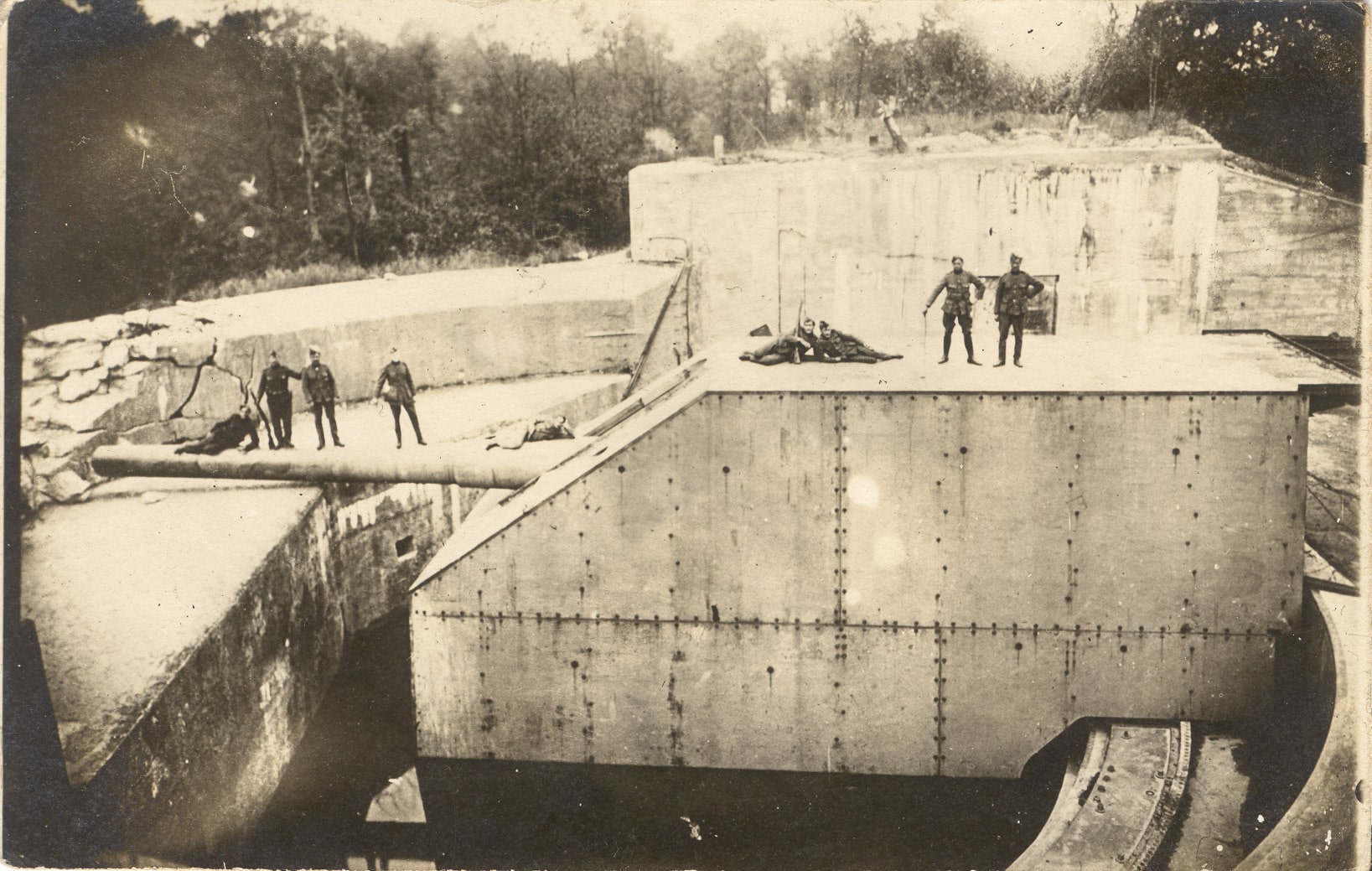 De geallieerden inspecteren het Duitse Lange Max-kanon in Leugenboom in 1918.De frequente beschietingen waren verwoestend en onafweerbaar. De projectielen overbrugden een veertigtal kilometer, in slechts 98 seconden tijd! Het kanon van Leugenboom zou pas verstommen toen de Duitsers zich vóór de wapenstilstand terugtrokken. Doordat de kanonniers er niet in slaagden het onklaar te maken en vanwege zijn grensoverschrijdende reputatie in de streek werd dit kanon een van de eerste bestemmingen van oorlogstoeristen.