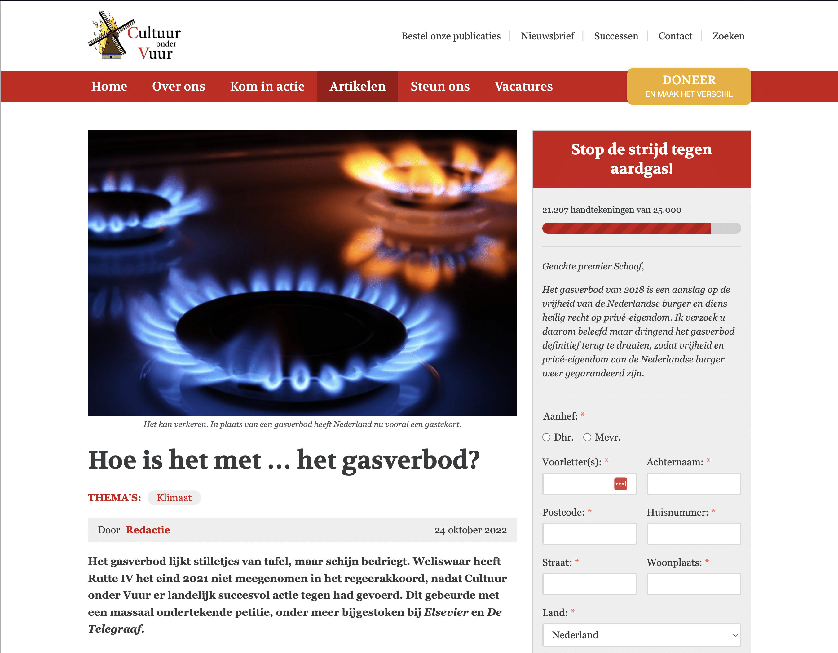 Het is voor tegenstanders van “het aardgasverbod” een dystopische toekomst vol overheidsbemoeienis. De campagne van Cultuur onder Vuur maakt deel uit van een gepolariseerd dossier waarin aan de ene kant voorstanders van het behalen van klimaatdoelen staan en aan de andere kant degenen die zich daartegen verzetten. Steeds vaker staan deze groepen lijnrecht tegenover elkaar. Tegen die achtergrond ontstond een strijd om de verbeelding waarbij verschillende actiegroepen en belangengroepen het op zich namen om de gevolgen van het al dan niet navolgen van het “aardgasverbod” te visualiseren. Op opiniepagina’s van kranten, in de Tweede Kamer, gemeenteraden en op sociale media woeden verhitte debatten over de noodzaak om “van het gas af te gaan” of om juist gas te behouden.