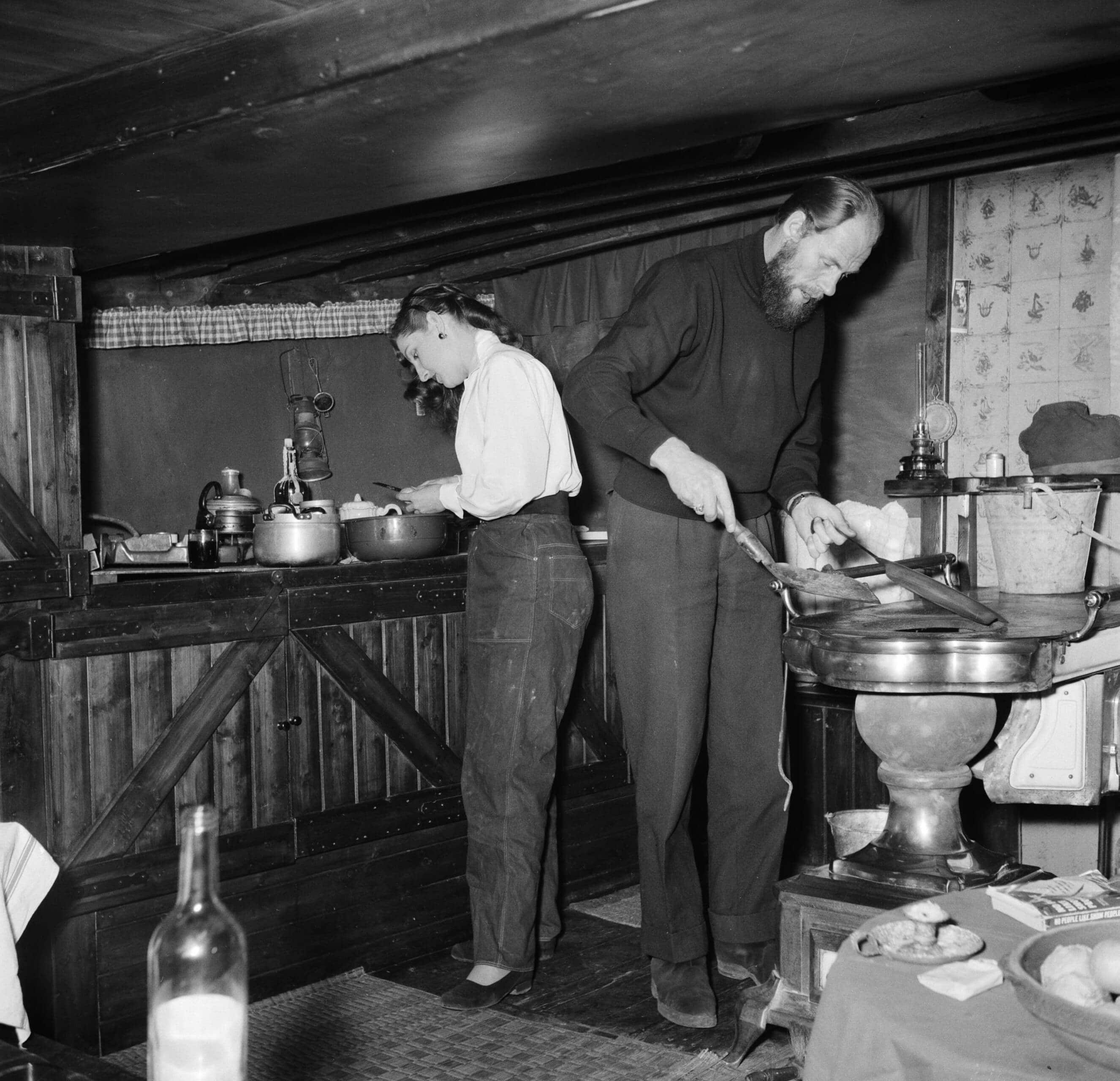Vrouw bij het schillen van de aardappels terwijl de man de kachel annex fornuis voorziet van kolen in de kombuis van het schip Siegfried & Erik in Parijs, 1950© Nationaal Archief / Fotocollectie Willem van de Poll