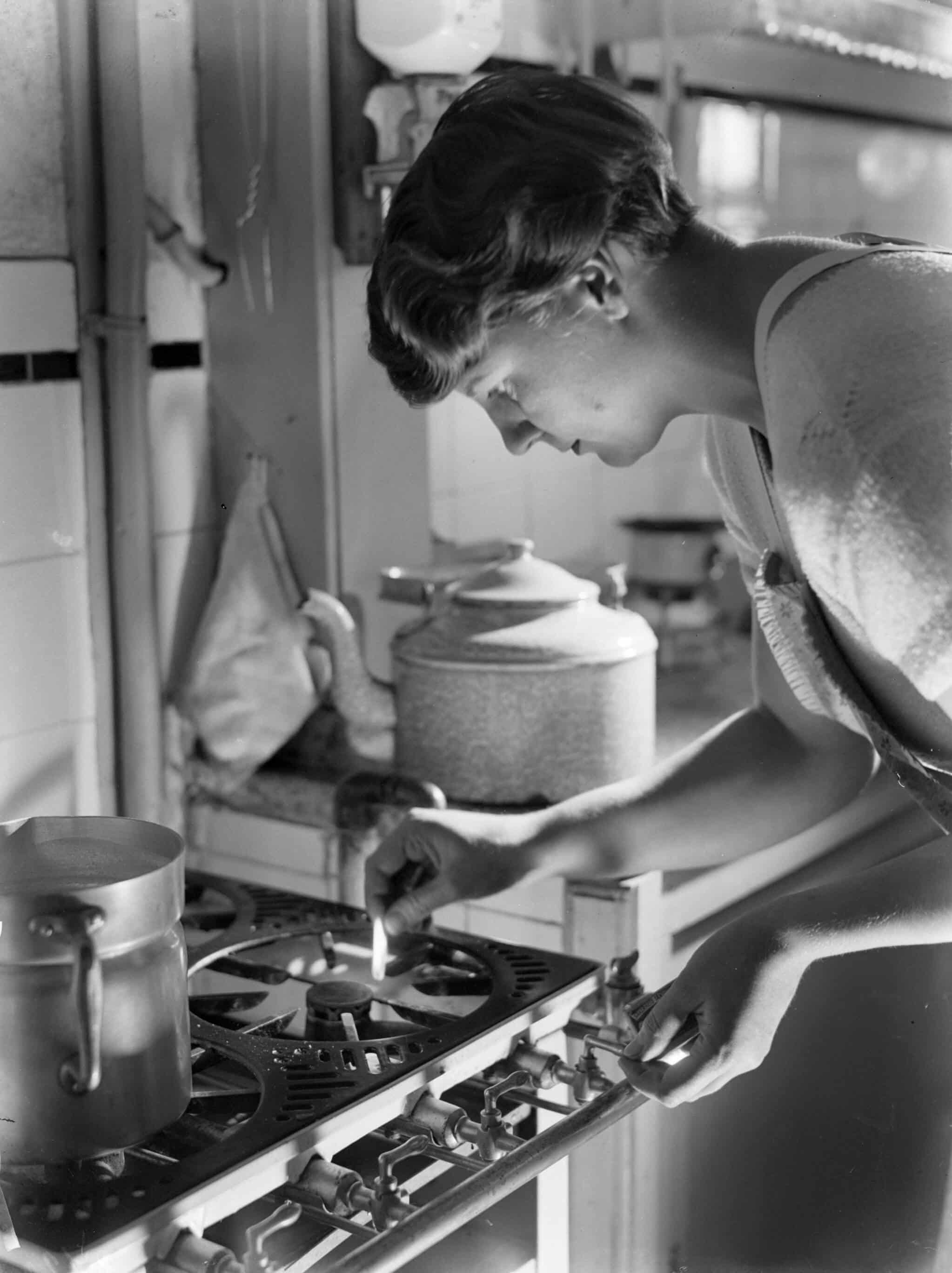 Nell Langlais, de vrouw van fotograaf Willem van de Poll, steekt het fornuis aan, 1933© Nationaal Archief / Fotocollectie Willem van de Poll