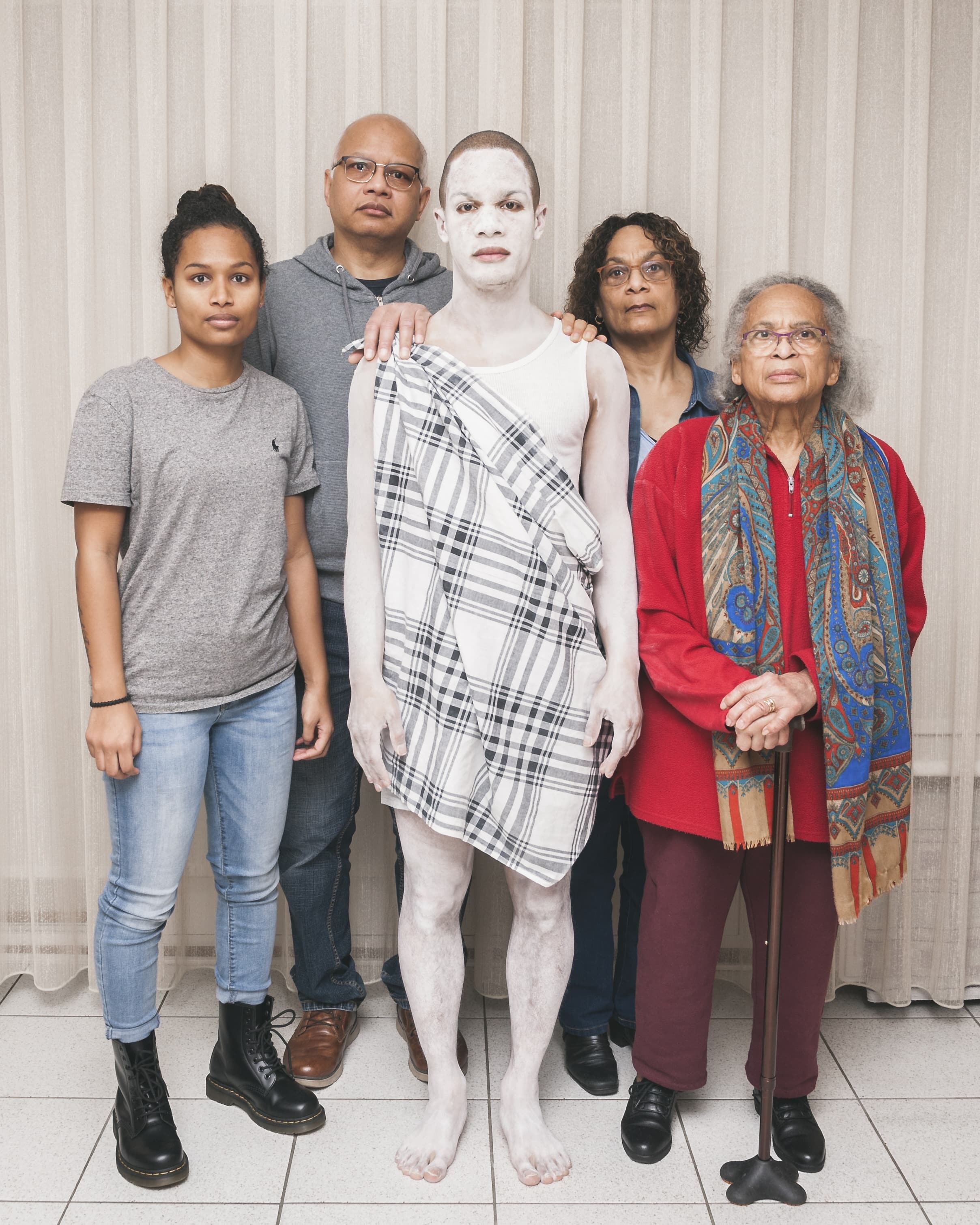 Family Self-Portrait maakt deel uit van Lingers afstudeerproject Hier praten we liever niet over! (2019), waarvan de titel verwijst naar hoe veel Surinaamse families zwijgen over winti – nog steeds aanzien velen het als iets satanisch, zegt Linger. De pemba doti behoort tot een ritueel waarin de oorlogs- en luchtwinti (goden binnen dit geloof) zich kenbaar maken aan hun asi: de mens die zij beschermen. Aan de foto zie je hoe winti binnen veel families taboe is, omdat Linger zo sterk afsteekt tegen de rest van zijn gezin. Maar je ziet ook hoe hij dit geloof weer de plek en aandacht geeft die het verdient.