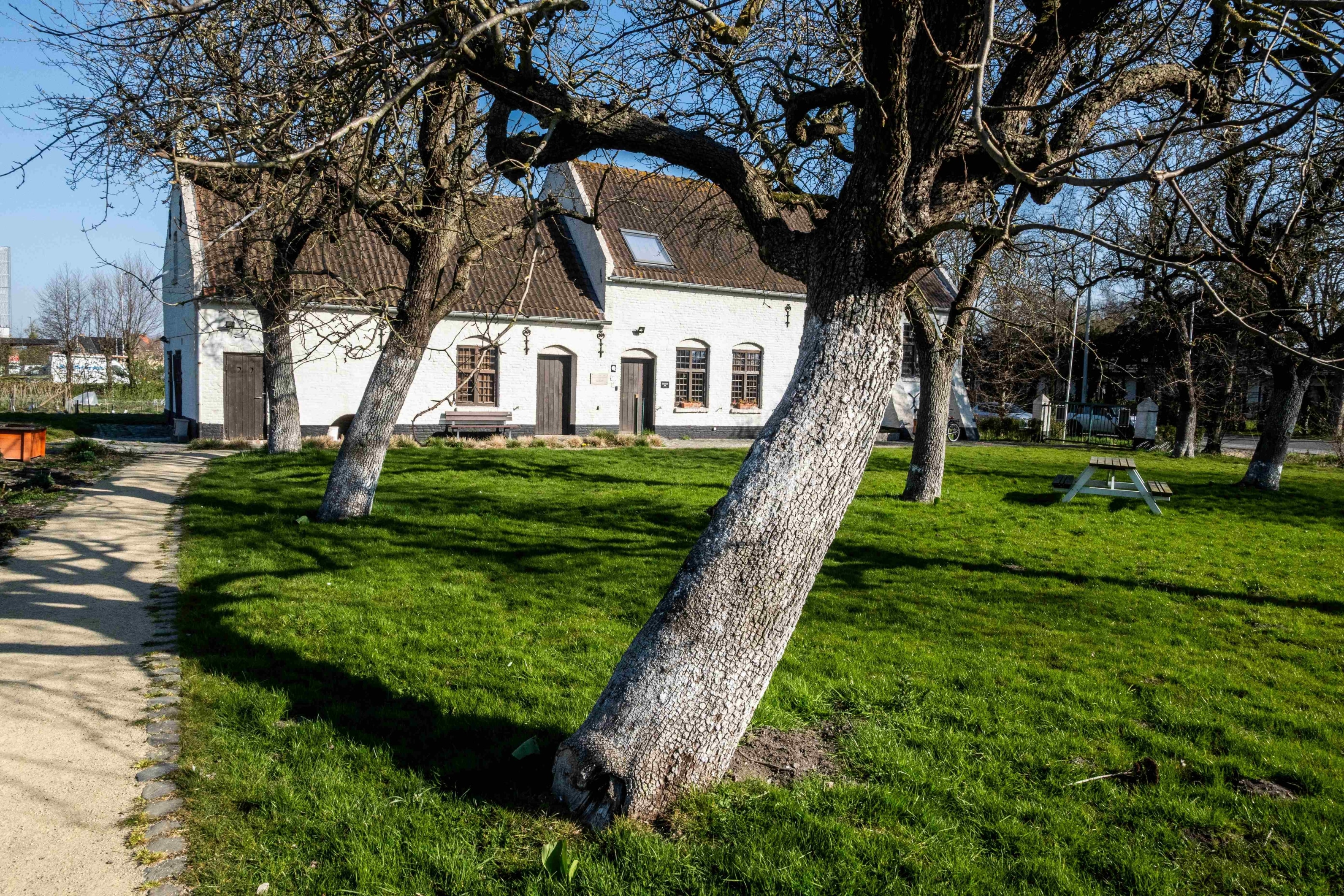 Buiten staan er prachtige perenbomen die extra visuele charme geen aan deze idyllische plek. Ze doen vergeten, of toch bijna, dat we ons hier op een druk kruispunt bevinden. Het terrein van dit voormalige hospitaal voor weduwen en behoeftigen, opgericht in de veertiende eeuw maar verwoest tijdens de Beeldenstorm, ligt tussen de afrit van de autosnelweg en de N8 Ieper-Veurne.