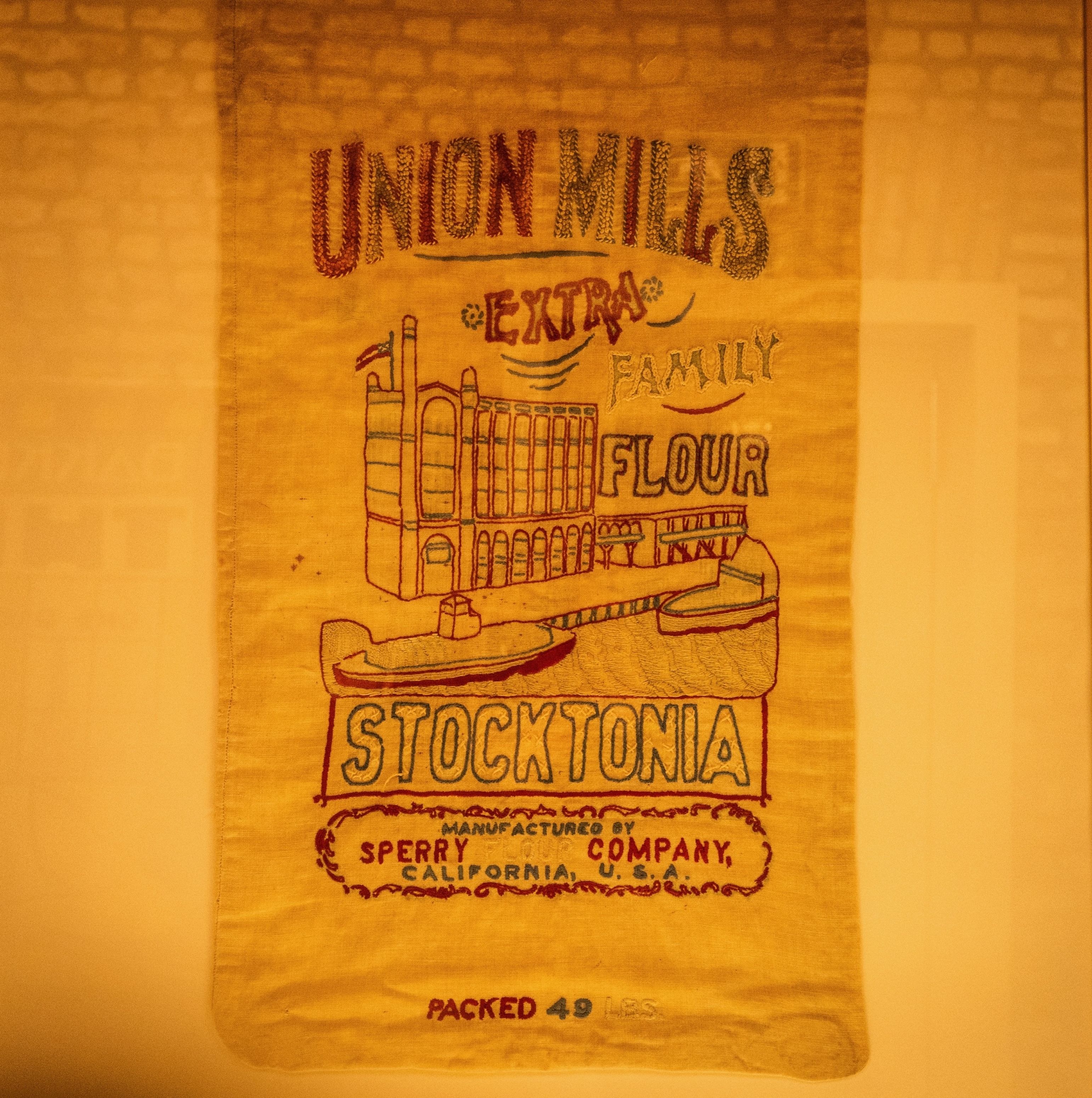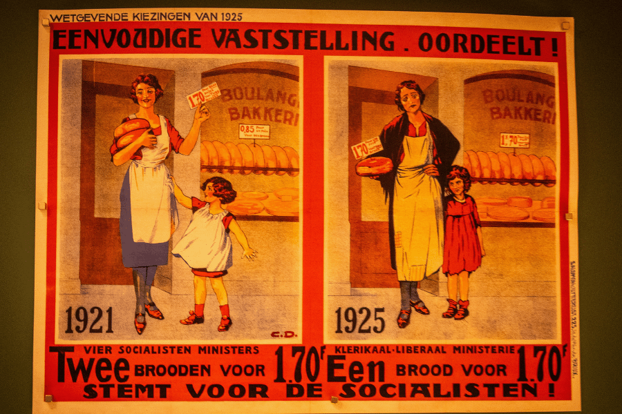 Boven ligt de focus eerder op de verbanden tussen brood en politiek, oorlog, religie of feestcultuur. Je ziet er bijvoorbeeld papieren broodzakken met stripfiguren zoals de Smurfen of affiches met gereglementeerde broodprijzen (tot begin de jaren 1990). Een bijzondere blikvanger hier zijn de gebreide meelzakken uit de Eerste Wereldoorlog, bedoeld voor liefdadigheidsverkoop. Ze zijn een erfenis van het bakkersgilde van weleer. “Het idee is om de verschillende evoluties ook te verklaren en uit te leggen waarom bakkers bijvoorbeeld zijn overgestapt op het maken van gebak. Of waarom ze het snijden van het brood aanrekenen aan de klant, enzovoort.”
