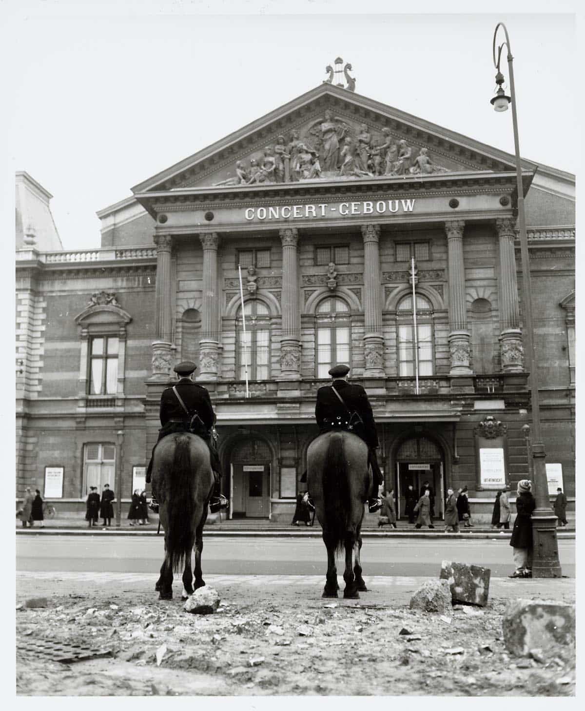 Politie te paard voor het Concertgebouw in Amsterdam, 1951© Internationaal Instituut voor Sociale Geschiedenis, Amsterdam