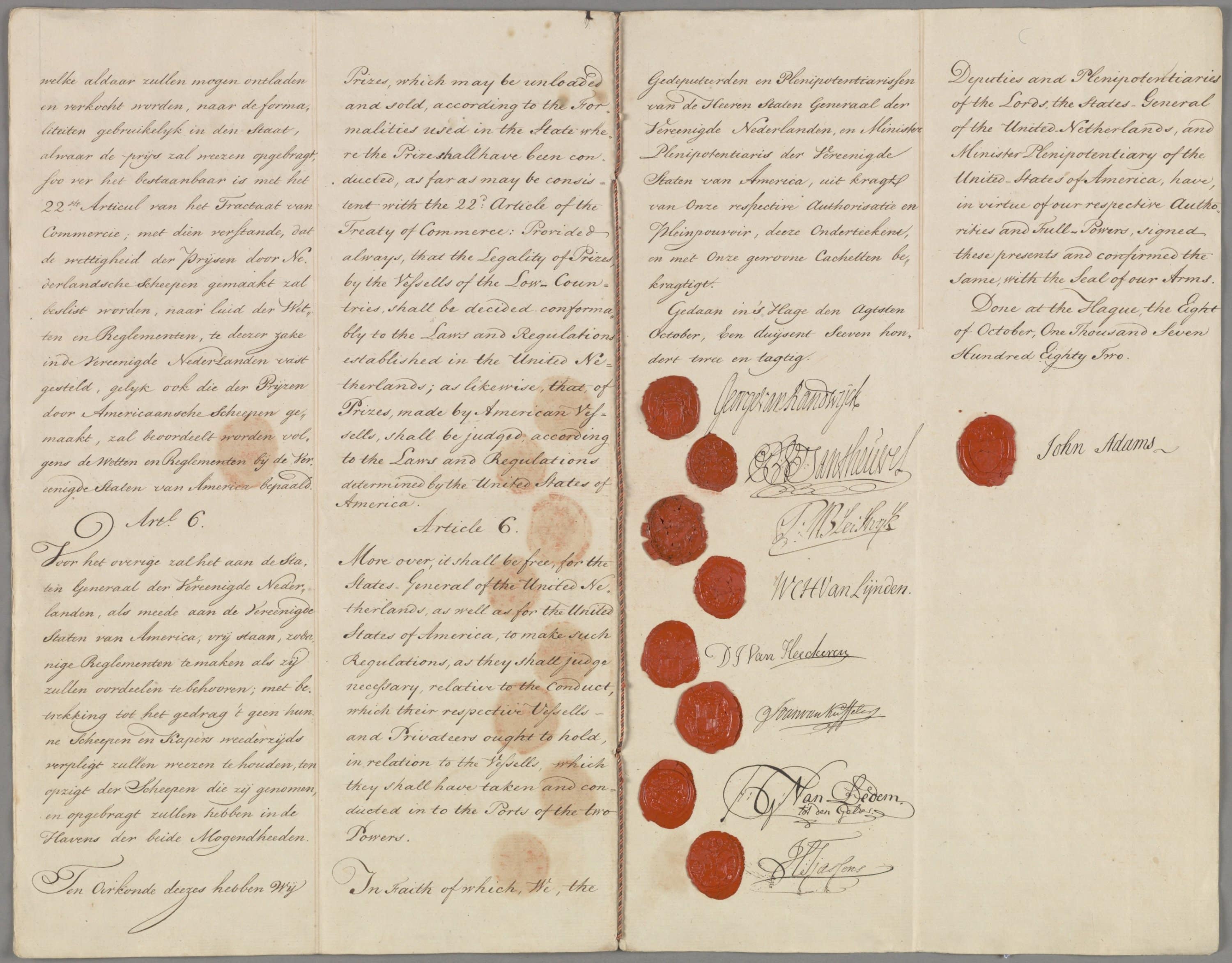 Het Amerikaans-Nederlandse handels- en vriendschapsverdrag uit 1782 met handtekening van John Adams© Nationaal Archief, Den Haag