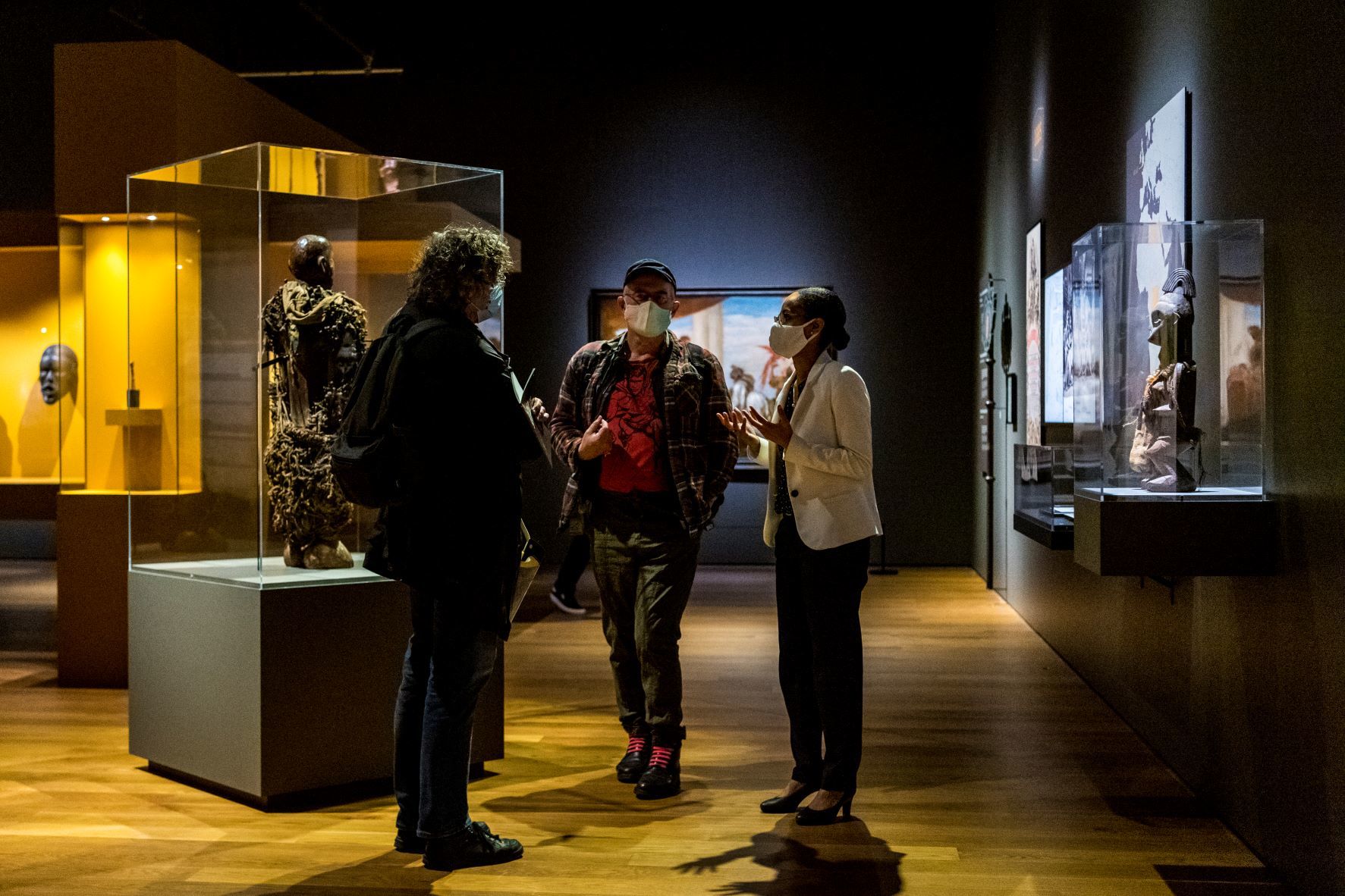 Prof. dr. Wayne Modest, sinds 2021 inhoudelijk directeur van het Wereldmuseum, die hier als gids optreedt: “In de huidige discussie over restitutie worden objecten soms zo gedomineerd door de Europese vraag of ze gestolen zijn, dat de schoonheid, de betekenis ervan op het tweede plan komt te staan. Een paar partners van ons in het land van herkomst zeiden: stop ermee onze objecten koloniale objecten te noemen. Daarom stellen we de betekenis voorop. Maar het is zoeken naar een balans. Binnenkort komt een touchscreen waar bezoekers meer informatie over de herkomst van objecten kunnen opvragen.”