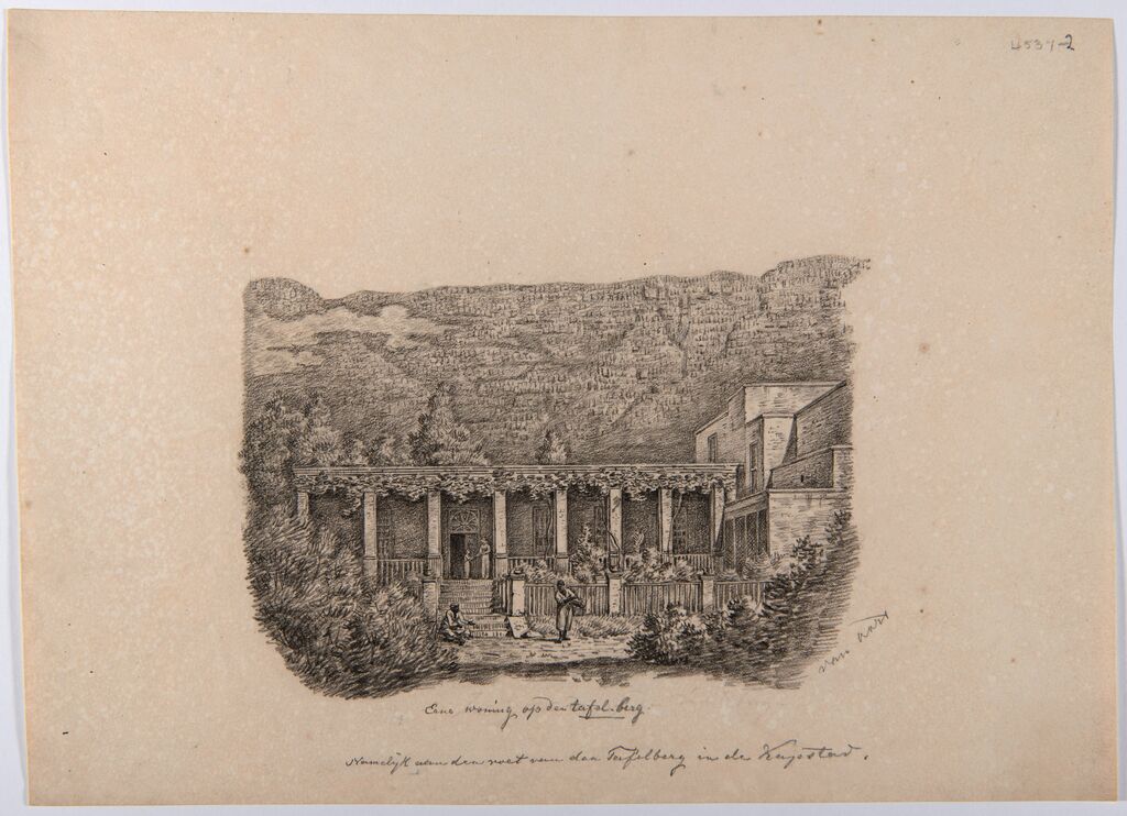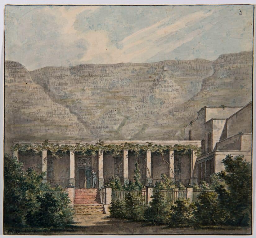 De schetsen van het landhuis in Zuid-Afrika waarop in de ingekleurde versie de Zuid-Afrikaanse mensen op de voorgrond zijn weggelaten© Collectie Wereldmuseum