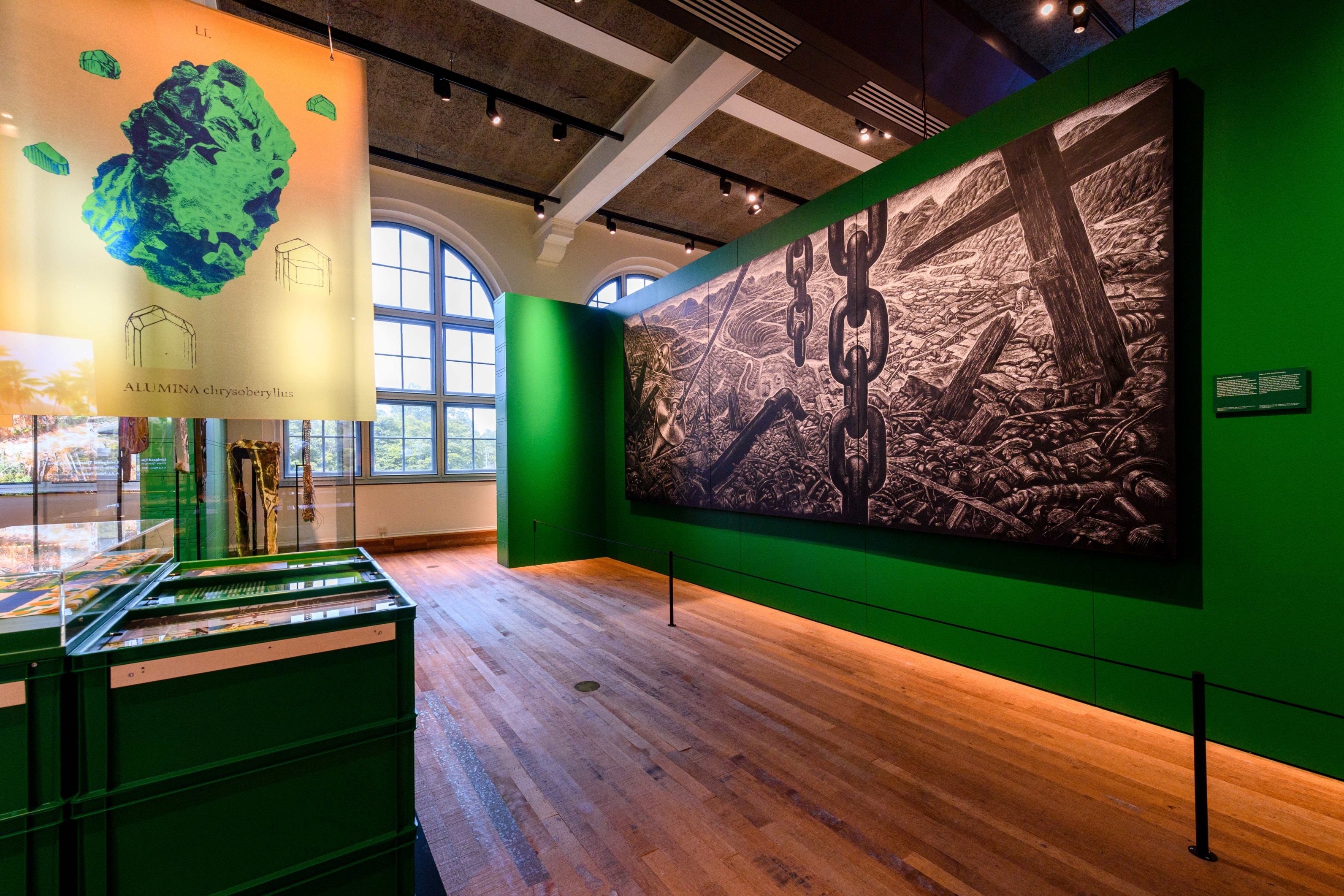 Voor een ander voorbeeld van kritisch commentaar op de collectie wijst Modest naar een groot zwart-wit hedendaags schilderij getiteld Tales of the Gold Mountain (2012) van een opengereten, vervuild mijnbouwlandschap met ketens en een kruis. ‘Hiermee vraagt de Indonesische kunstenaar Maryanto onze aandacht voor mijnbouw en wat extractie betekent. Sommige monsters van mineralen horen tot de eerste objecten van onze collectie. Als je naar de schitterende objecten in ons museum kijkt, besef dan dat het metaal ergens is uitgehaald, en dat dat ook nu nog effect heeft op de planeet.”