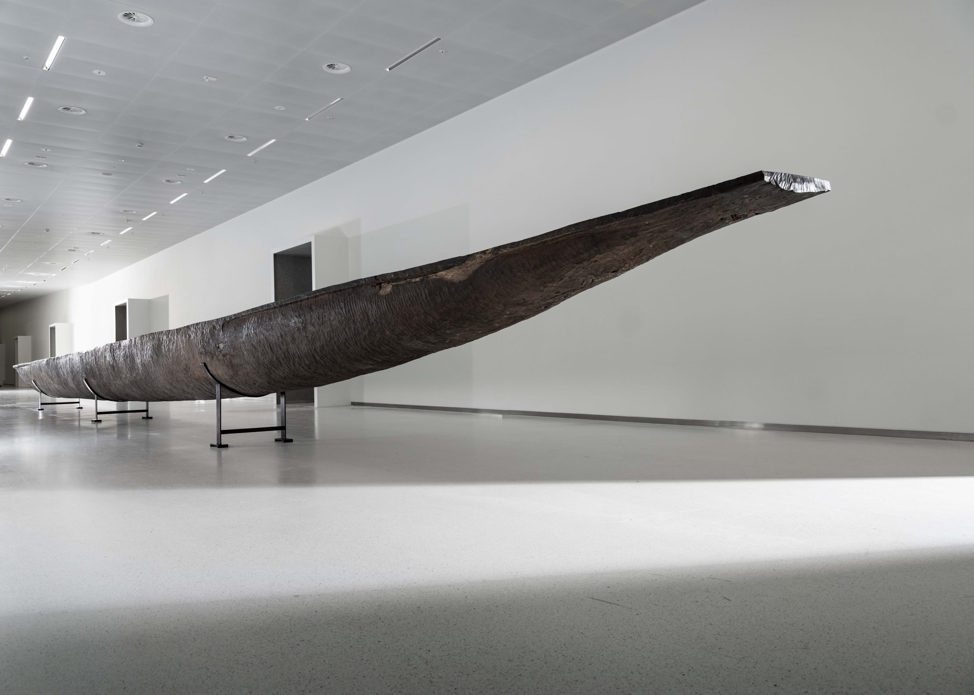 Klinischer kan het bijna niet. Een ruim twintig meter lange, met de hand uit een Sipoboom gehakte prauw, die staat opgesteld in een helder verlichte, witte keldergang van het museumgebouw. Dit is waar de bezoeker van het AfricaMuseum in Tervuren zijn tocht door het imposante koninklijke ‘Koloniënpaleis’ begint. Het vrijwel totale gebrek aan context maakt het gebruiksvoorwerp tot een abstracte vorm die doet denken aan een modern kunstwerk, ontrukt aan de rivier van de tijd. Op de muur erachter de intrigerende, veelgeciteerde tekst: “Alles gaat voorbij, behalve het verleden.” De prauw, afkomstig uit een dorp aan een zijtak van de Congostroom en in 1958 naar België verscheept, komt niet vooruit.