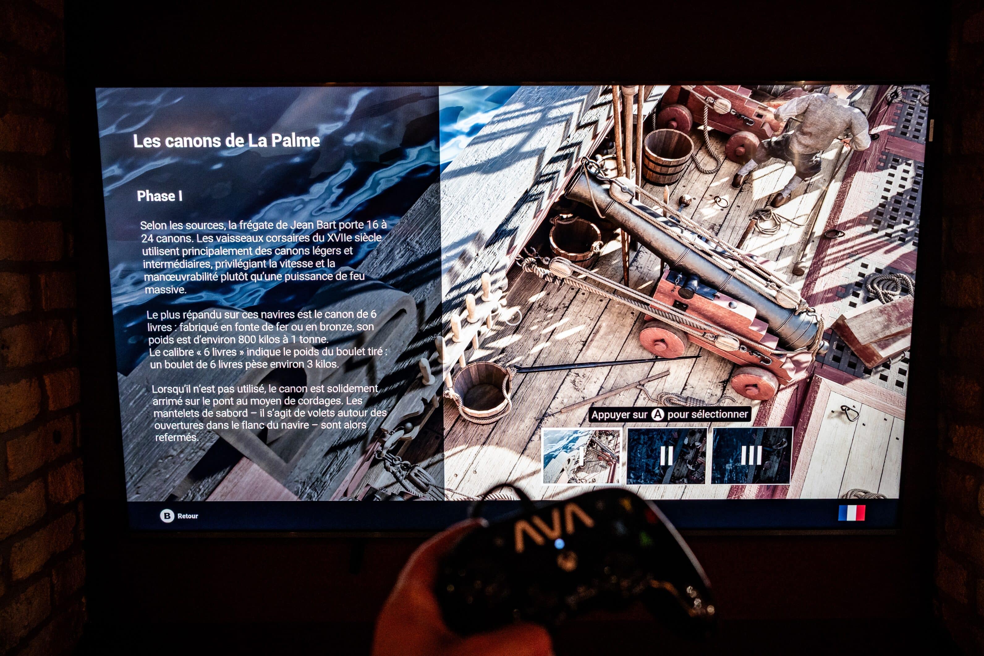 Eén van de resultaten van de inspanningen op lange termijn was de creatie, enkele maanden geleden, van een immersieve ervaring: Jean Bart. La préparation de l’abordage (Jan Baert. Klaar om te enteren). Via een gamecontroller kunnen bezoekers bijvoorbeeld het fregat van de bekende Duinkerkse kaper Jan Baert verkennen, of historische objecten manipuleren. “Het bureau AVA – Advanced Visualisation Agency – heeft tot in de kleinste details gewerkt, zoals de nerf in het hout en de weergave van de stoffen.” De ervaring valt in de smaak bij jonge bezoekers, die de objecten daarna terugvinden in het museum. Een vervolg staat op de planning.
