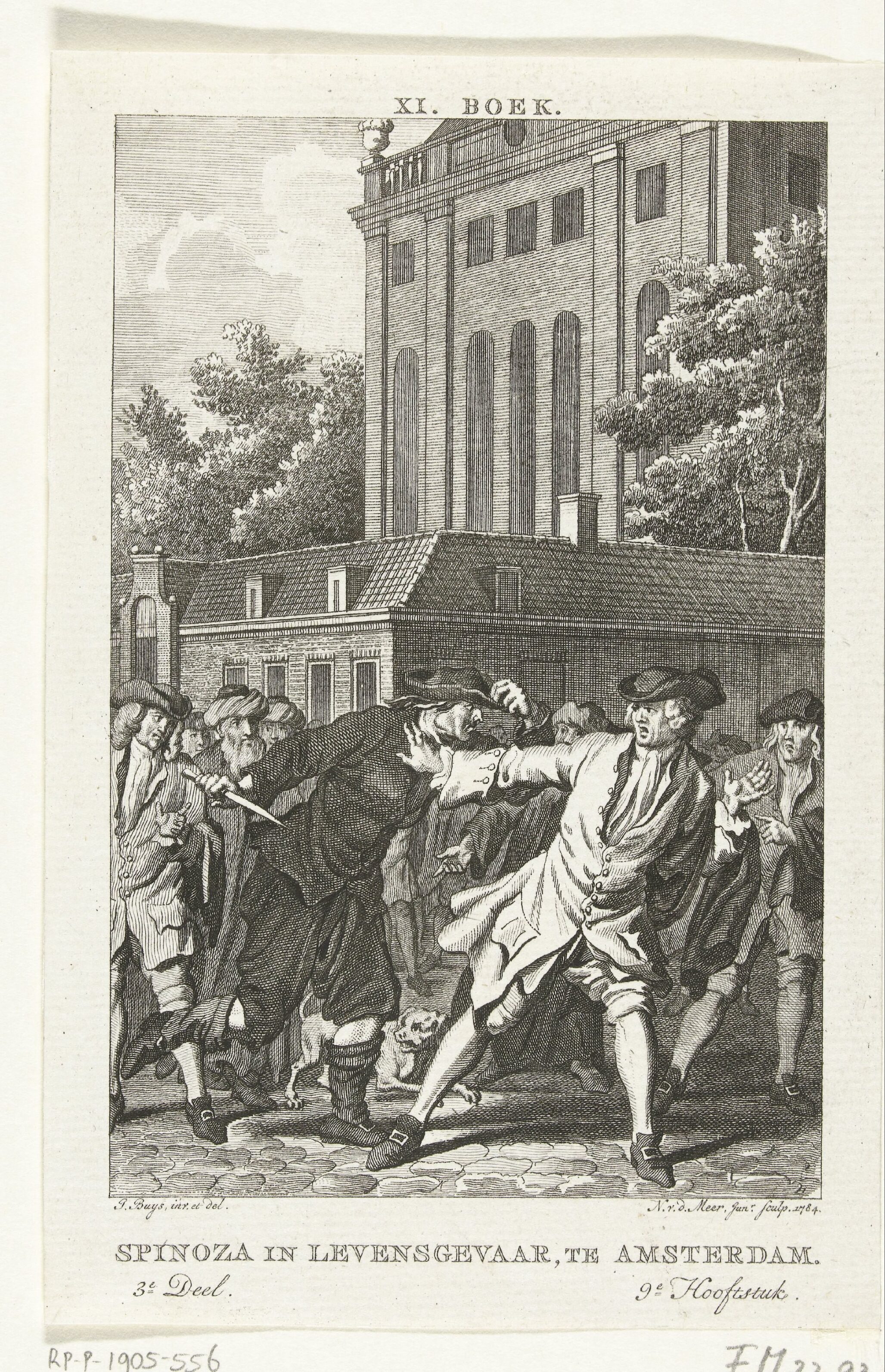 Spinoza bedreigd door een woedende menigte te Amsterdam, 1667, prent van Noach van der Meer naar een tekening van Jacobus Buys, 1784 © Rijksmuseum, Amsterdam