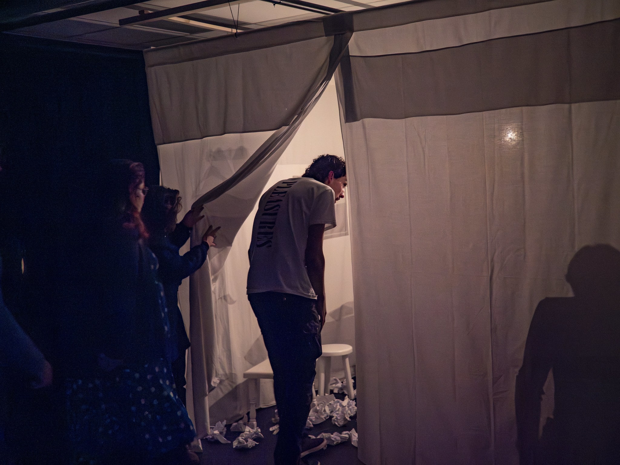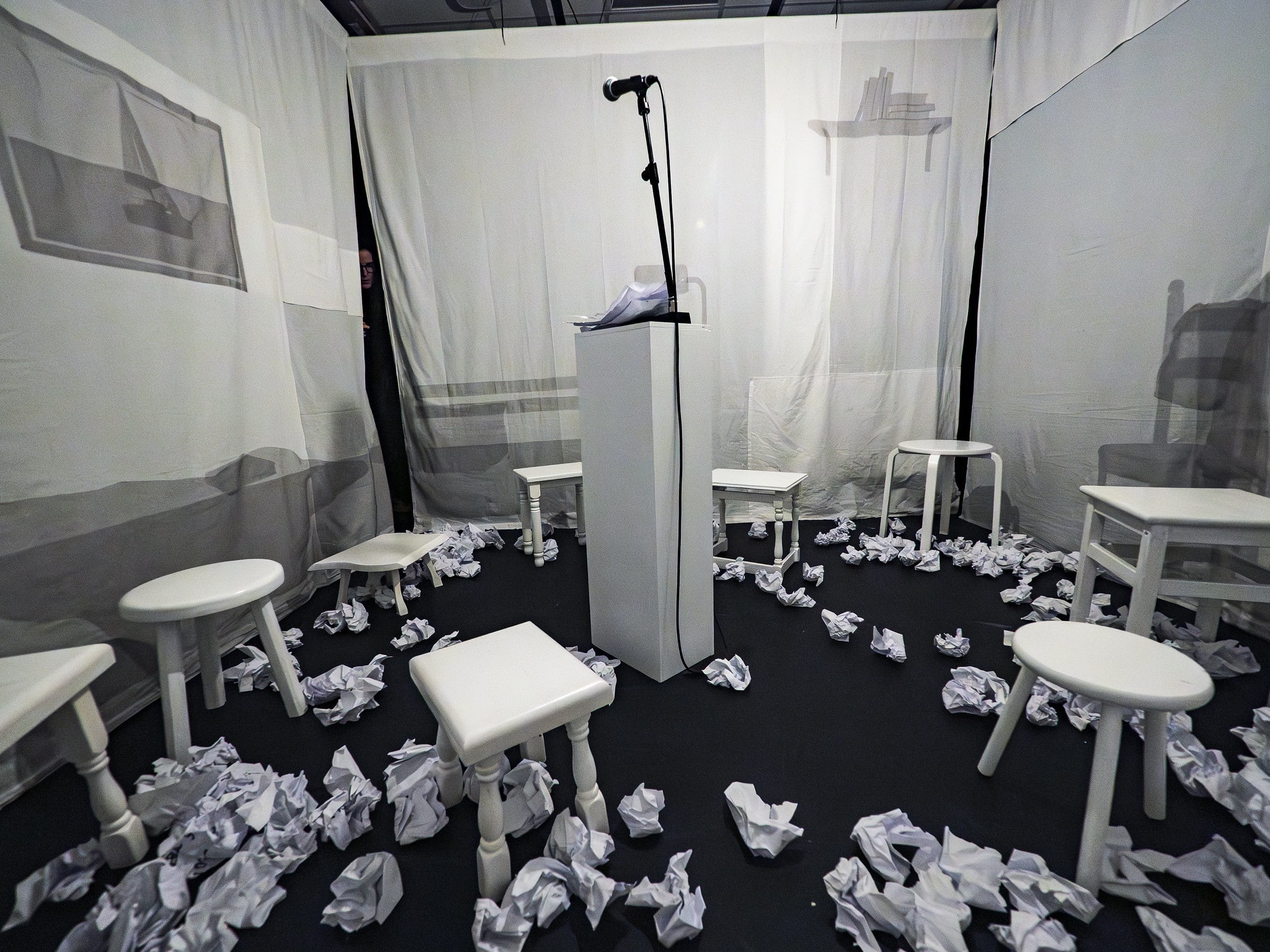 Met een stuk of zeven toeschouwers stap ik een volledig witte ruimte binnen, we gaan zitten op krukjes tussen verfrommelde propjes papier. De wanden tonen een kleine slaapkamer, met een bed, bureau, klok, stoel en boeken, maar zonder deur. Audiofragmenten van politici en activisten over beleid, klimaat en migratie dringen als een wervelwind de ruimte binnen. Stemmen die ik ken uit nieuwsberichten stapelen zich met een grote snelheid over elkaar heen tot een kakofonische ruis.