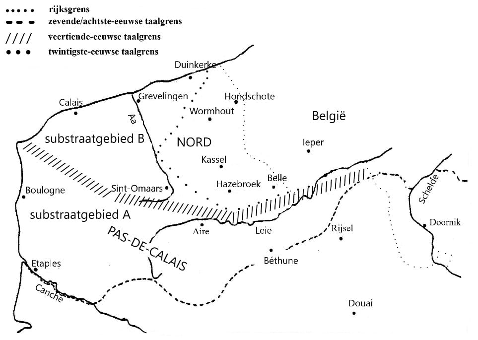 Het is bekend dat de verschuiving van de Romaans-Germaanse grens naar het noordwesten samenhangt met het binnendringen van het Picardisch dat door een deel van de bourgeoisie in de grotere steden werd gesproken en daarom waarschijnlijk meer prestige genoot. Met name het departement Pas-de-Calais werd vanaf de negende eeuw eerst gepicardiseerd en vervolgens verfranst. De uiterste noordwesthoek is echter nooit picardofoon geweest, maar is “rechtsreeks” verfranst. De vraag rijst waar dat Frans vandaan komt.