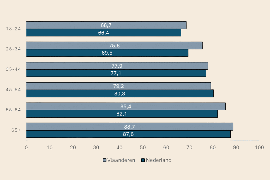 Gemiddelde scores voor stelling ‘Ik vind Nederlands een mooie taal’ voor Nederland en Vlaanderen per leeftijdsgroep