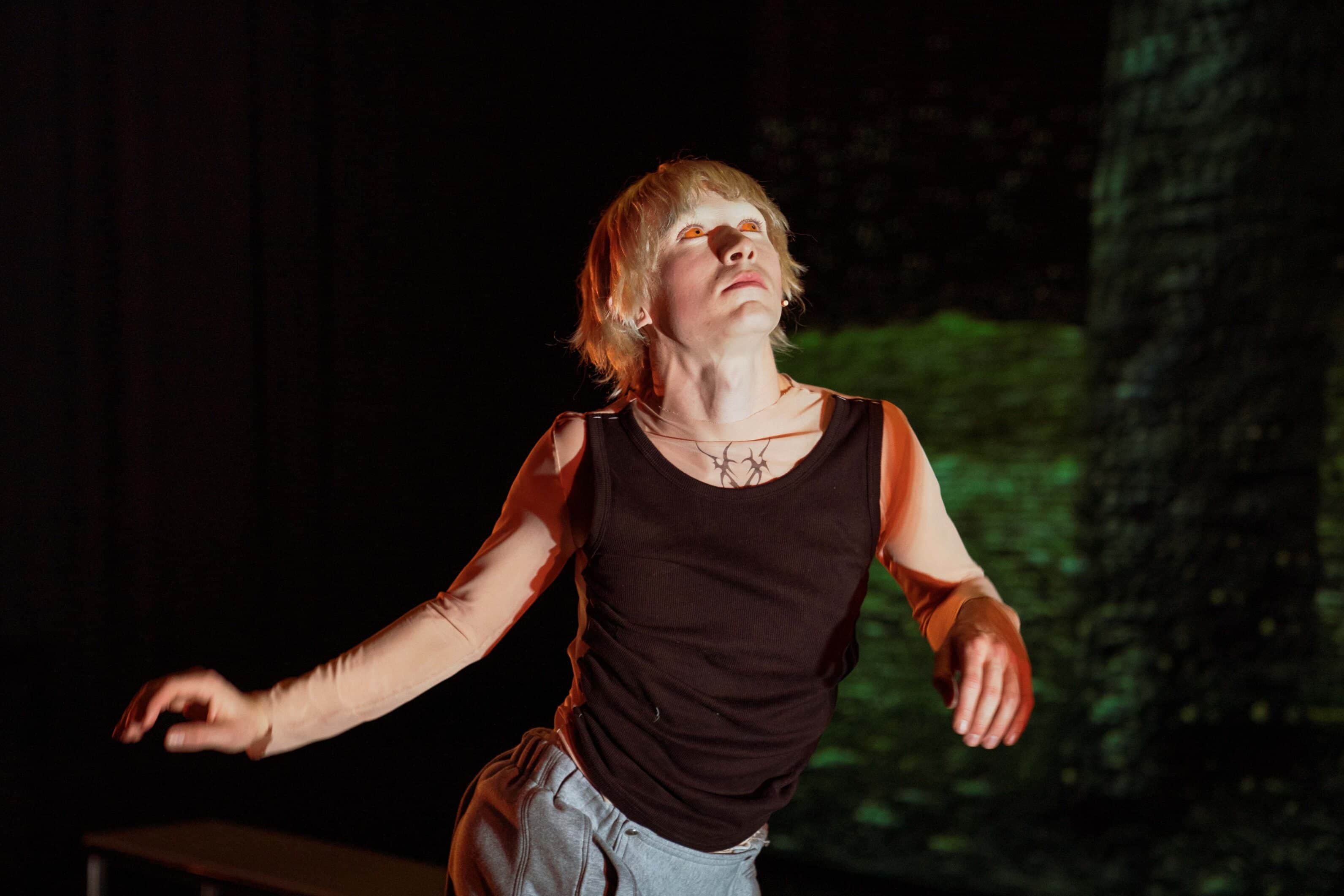 Een onbestemd wezen zoekt in een digitale wereld naar intimiteit, en ondergaat daarvoor transformatie na transformatie. In Zero Feet Away laten theatermakers Tibau Beirnaert en Laurens Aneca technologie en identiteit gevoelig tegen elkaar opbotsen.