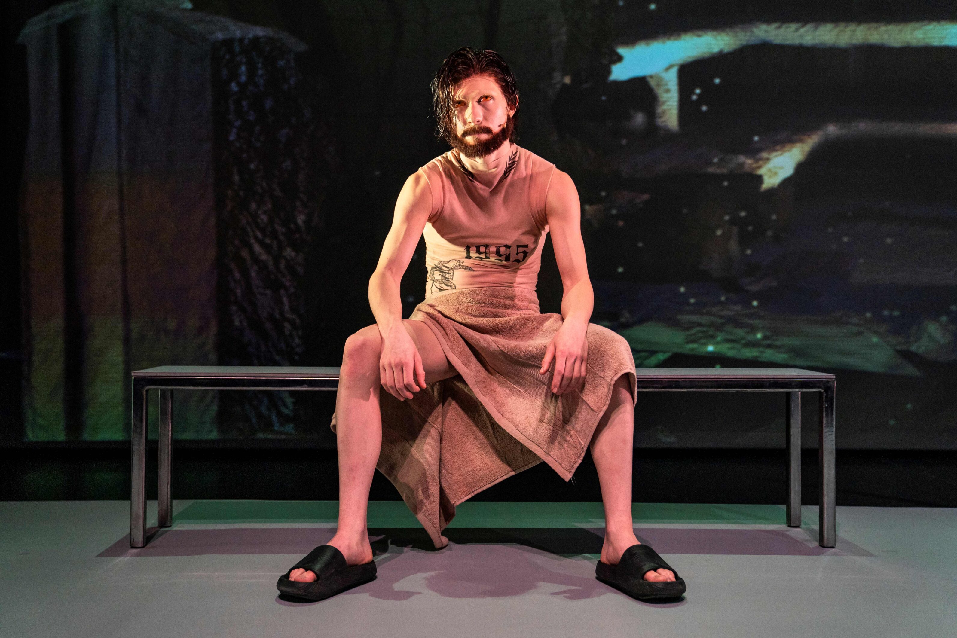 Iets klopt niet, maar wat? Is het de man met baard, tattoos en een omgeslagen handdoek, die op het podium rondhangt en er meer uitziet als een holbewoner dan als een moderne man? Of word ik nerveus van datzelfde lichaam dat zich even later, naakt en ontdaan van de baard, vrijwel gender- en identiteitsloos door de voorstelling heen zal kronkelen? Misschien zit de spanning wel ín het lichaam opgesloten en worstelen de interne woelingen zich naar buiten.