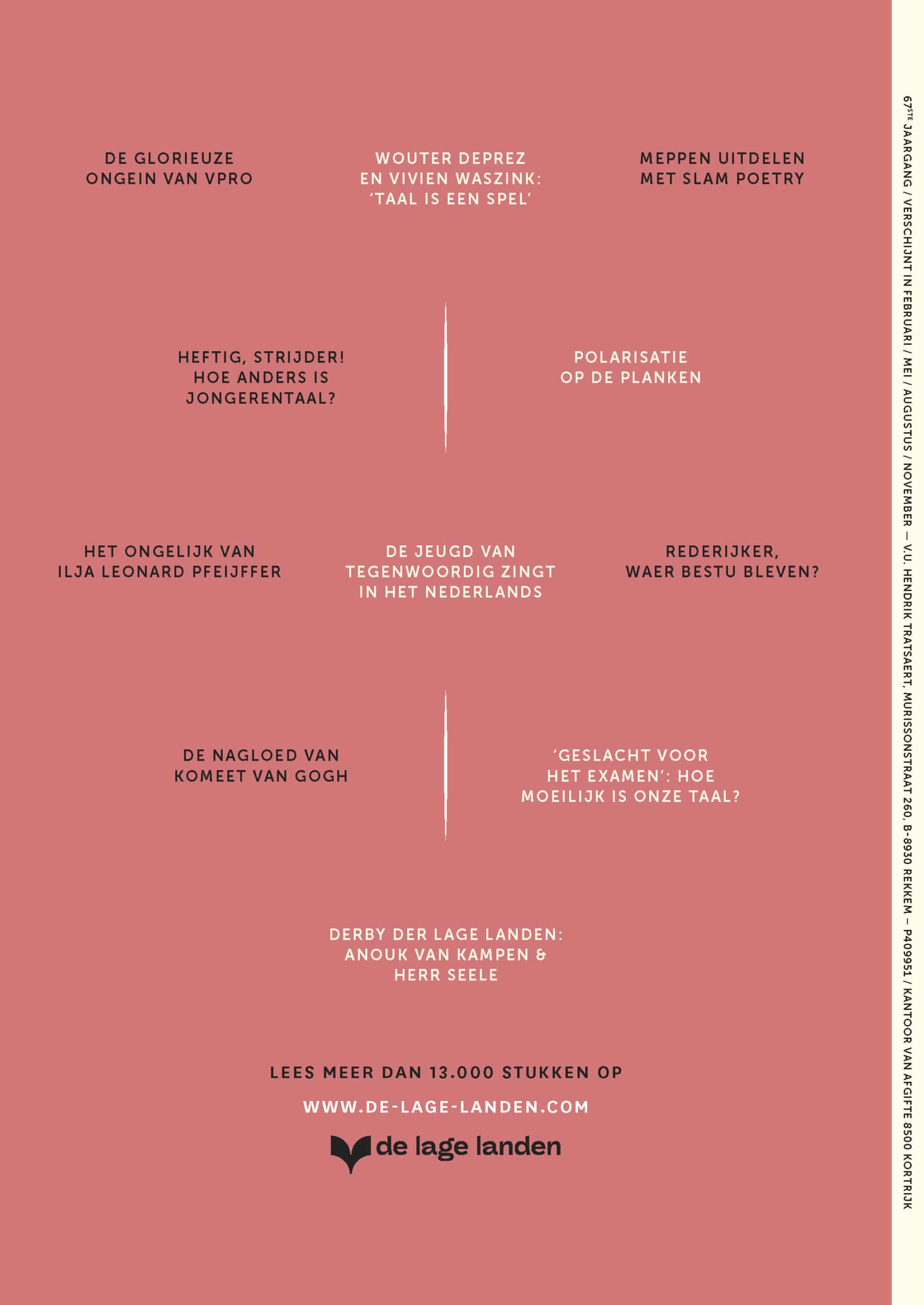 Taal is spel. Spel is liefde. Liefde is feest. Taal is feest. In dit nummer speelt de lage landen volop met het Nederlands. ‘Taal draait om plezier’, zeggen taalkundige Vivien Waszink en cabaretier Wouter Deprez in een dubbelinterview. In de andere stukken gaat het over jongeren en hun bijzondere taalgebruik, over de enorme populariteit van Nederlandstalige popmuziek, over nieuwe en oude spreekwoorden, over spoken word en slam poetry, over hedendaagse rederijkers, creatieve speechschrijvers en nog veel meer. Vier de taal!